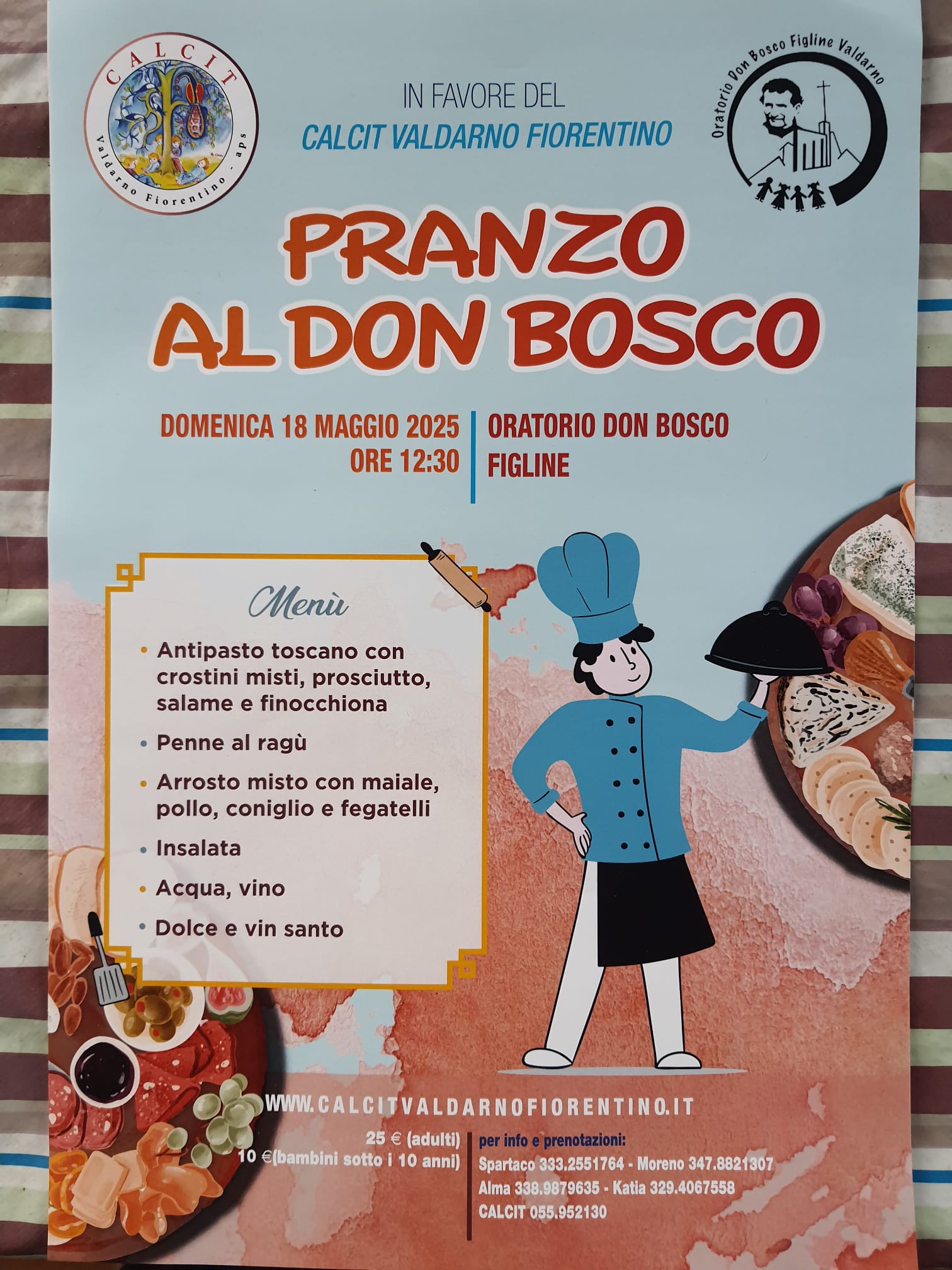 Vi aspettiamo tutti, domenica 18 maggio alle ore 12:30 all'oratorio Don Bosco di Figline e Incisa Valdarno per il pranzo organizzato in favore del CALCIT Valdarno Fiorentino.